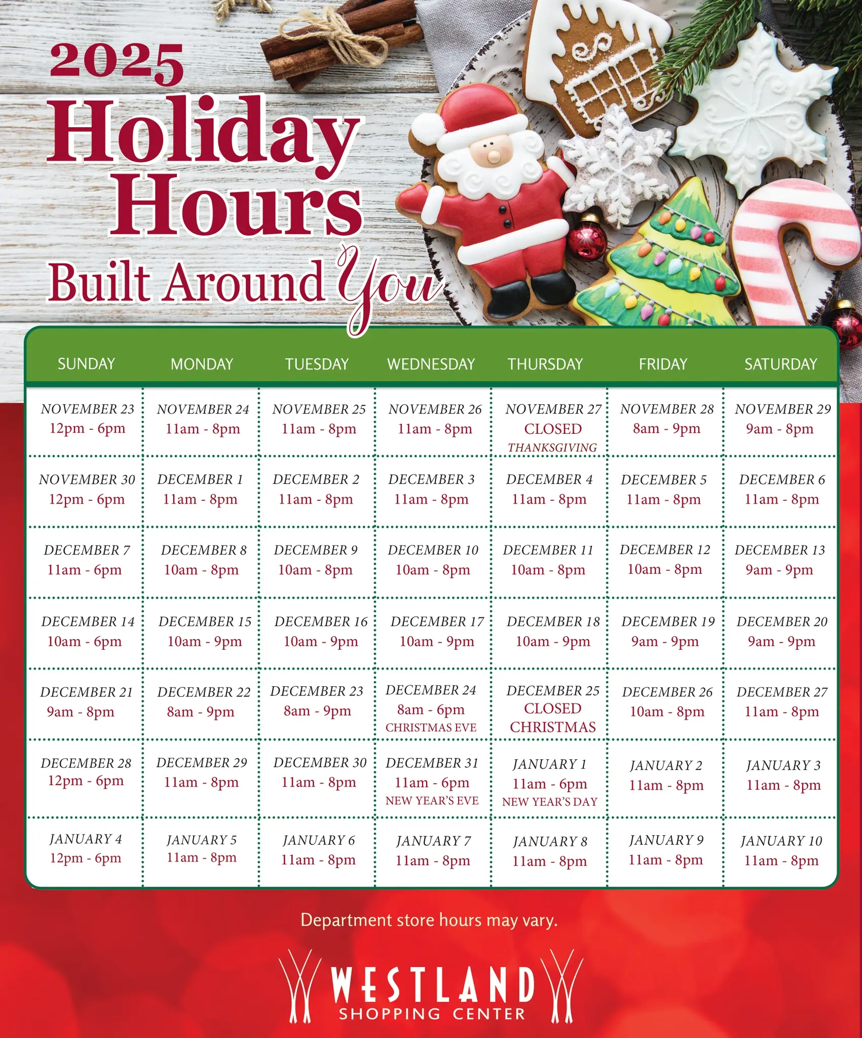 Westland had holiday hours built around you! Please see the calendar below for extended hours throughout the holiday season!